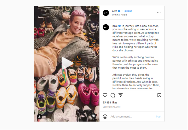 Ils encouragent activement les collaborations avec des sportifs de renom. Ces partenariats sont pertinents, conformes à la marque et permettent à Nike d'exploiter les adeptes de chaque célébrité. Le contenu des Reels qu'ils partagent régulièrement met l'accent sur la nature progressive de la marque et montre la direction qu'elle prend. Cela permet à Nike d'être perçue comme une marque fraîche, innovante et avant-gardiste.